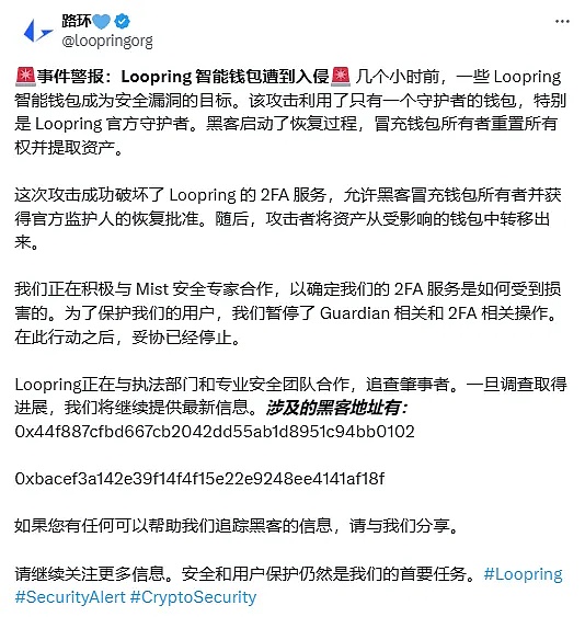 (5) 6月9日,Loopring智能钱包遭到入侵,该攻击利用了只有一个守护者的钱包,特别是 Loopring官方守护者。黑客启动了恢复过程,冒充钱包所有者重置所有权并提取资产。黑客将所盗Loopring资产已全部兑换为以太坊,地址目前持有1373枚ETH,价值超500万美元。