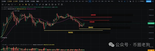 最近大饼也从最近的下降趋势中走出,从图中可以看到,这轮回踩,大饼日线级别最低插针到58402附近,价格没有跌破之前日线级别双针探底的低点56552,说明短期58402支撑是有效的。