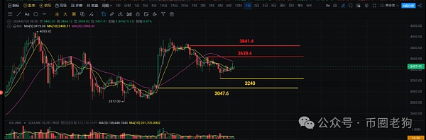 以太从日线级别来看,这轮下跌最低插针到3240附近,价格没有跌破之前大阳线的低点3047.6,所以短期日线级别支撑3240还是有效的,目前以太价格已经站稳了日线级别5 10MA均线上方,日线级别也从下跌趋势中走出。上方3638.4和3841.4为以太近期日线级别的压力位,这两个位置都是价格反弹过后日线级别下跌大阴线跌穿日线级别均线的高点位置,只有这两个位置突破币价才有可能继续向新高进发。