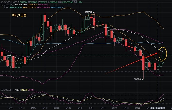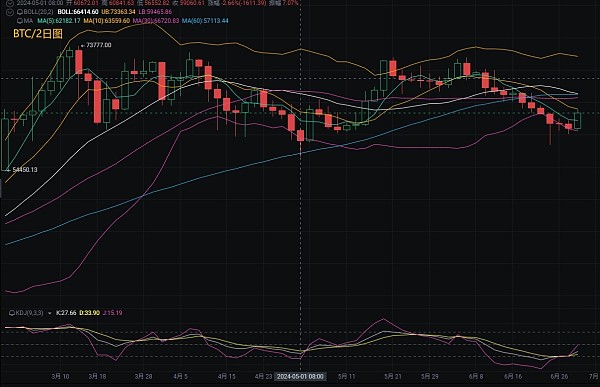 比特币近期低位回撤60000一线走出强势反弹,目前近两日行情回暖价格是有所上升,从技术面上看,目前这个走势就是跌之后的反弹修复过程。整个6月比特币整体跌幅超过万点,所以短时间修复力度也是比较强,笔者币先生提醒各位,切记不要因为这波反弹达到几千点,就以为是多头反弹的信号,其实不然,从日线级别的走势上看,日内价格到日线布林中轨64000一线压制回调,短期反弹没有突破企稳64000一线,跌势就还会存在,所以切勿因为一时行情的修复整理,而以为是反转信号的出现。
