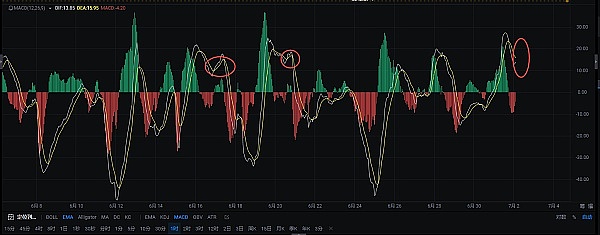 4小时图中可以看到早间K线冲破顶部EMA200后也是在回调直线压力下形回撤于EMA80位置,当前行情再次冲高试图站稳EMA200,二次冲高回调直线压力位置;当前压力给到了3530-3550;MACD中0轴上方放量也不是那么强势了,DIF与DEA也在0轴上方形成收口;