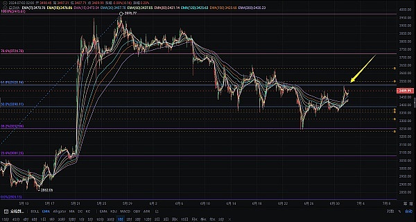 以太坊1小时图k线早间冲高3525位置形成回落于EMA30支撑正在形成u型二次探顶,可以看到也是刚好在回调直线压力位置下来的,那么后续可以继续关注二次探顶能否突破;