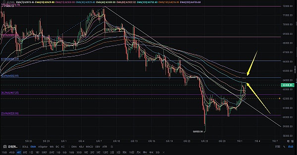综上所述大饼行情短期还会再次形成承压回撤,操作上还是保持高空入场即可,大家还是要;建议关注大饼4小时k线能否站稳EMA120,然后再看EMA150位置能否到,可参考以太的做空与补仓机会,记住不能盲目追多,当前位置多被套的风险永远大于空!