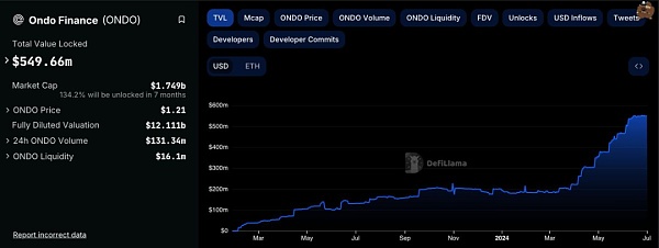 在加密货币领域,$ONDO 表现突出,今年以来总锁仓价值(TVL)增长了两倍多。