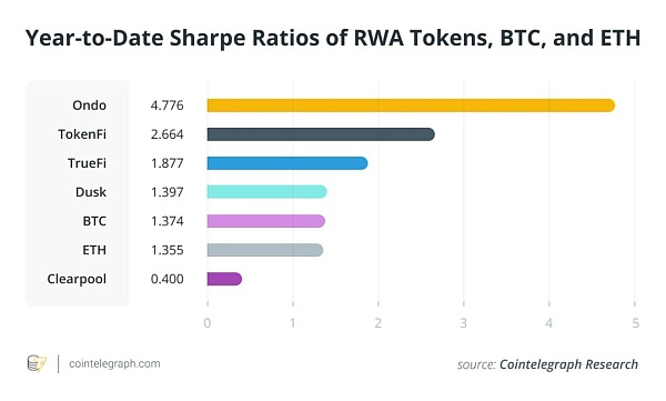 现实世界资产(RWAs)是代币化运动中最热门的领域。从1月1日到5月31日,许多 RWA 领军项目的夏普比率优于 $BTC。更高的夏普比率表明更优越的“风险调整后”回报。