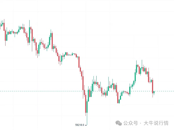 日线底部长期震荡突破后,又进入新的震荡模式,日线吊线后收阴,整体还将是弱势,今日依旧有小幅回踩刷新低点的需求,而在刷新低点后则可能是良好的买入机会,前提是价格在60700之上震荡。
