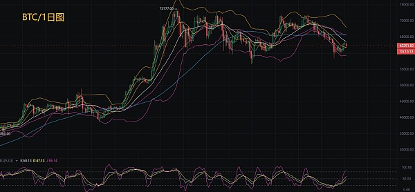 内日价格跌破4小时布林中轨后,目前价格再次回到布林中轨上方运行,日线来看中压力位向下移动,布林带向下缓慢缩口,MACD放量结束开始缩量下行,目前上方阻力位重点关注63700-64000区域,下方支撑关注60500-60800,