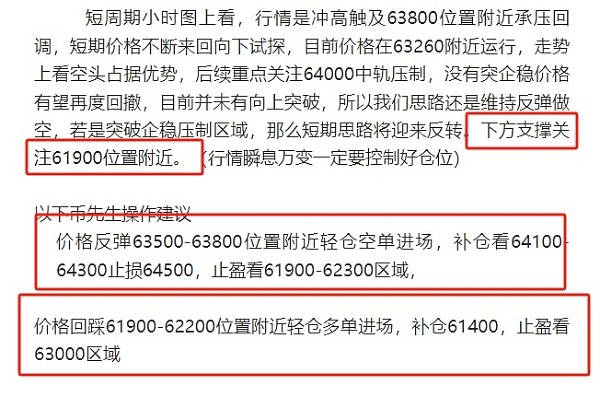 价格反弹63200-63500-53800位置附近轻仓空单进场,补仓64200,止损400点,止盈看62500,62000,