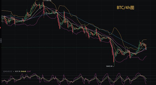 比特币目前价格在59720附近运行,日内价格持续回调,跌破60000但是触及59600位置有小幅反弹走出,短期走势还是维持弱势震荡,小时图来看MACD开始缩量,EMA60和中轨平行向下,日线中轨缓慢持续向下,上方阻力也在向下移,日线kdj已形成金叉,操作之上建议,还是反弹空单为主,回调轻多单为辅(多单轻仓还好止损本金安全第一位)