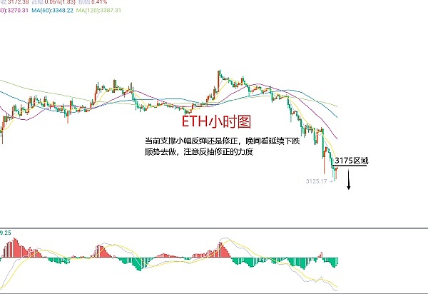 7月4日以太坊(ETH)合约技术面分析:今日方面,大周期日线级别昨日报收小阴线,K线形态连阴下跌,价格在均线下方,附图指标二次死叉向下放量运行,那么这样来看大趋势上下跌是很明显的,需要注意的就是力度和延续问题。另外消息面的刺激导致价格反抽风险也是需要关注的;短周期小时图早间下跌破低,午间修正当前支撑出现小幅反弹,但看不到力度所以还是修正,且延续看下跌的话,反抽力度不能大,否则难跌,这是走势规律,因此今日ETH短线合约交易策略:现价3175区域直接空,止损3203区域,目标看3120-3105区域
