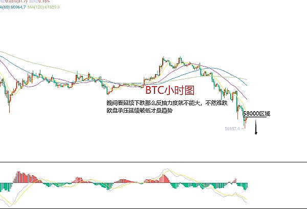 7月4日比特币(BTC)合约技术面分析:今日方面,大周期日线级别昨日报收小阴线,K线形态连阴下跌,价格在均线下方,附图指标二次死叉向下,这也就是我们前天说的,价格的力度和延续性都有了,那么二次死叉就有了,所以当前的趋势方面是很明显的下跌走势,这个先明确,当然也要注意消息面的刺激导致价格反抽风险;短周期小时图早间大阴下跌向下破位,午间修正欧盘延续,当前K线形态连阴单阳,价格在均线下方,附图指标死叉,那么今日我们还是看延续下跌走势,因此今日BTC短线合约交易策略:现价58000区域直接空,止损58350区域,目标看57200-57000区域;