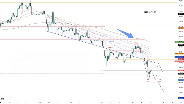 4小时图表 观点:看空↓,同时也需要关注币价是否能守住56,000美元的水平。