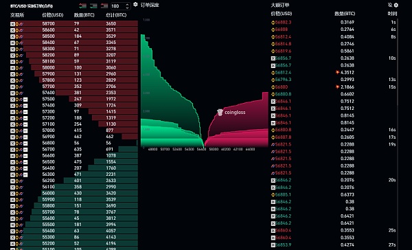 首先从订单簿上面的显示,在56,000美元附近的买单较多。因此比特币如果短期能够守住这个价位,将能避免进一步的大幅下跌。