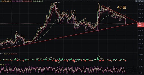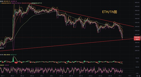 短周期小时图上看,布林带呈开口姿态,各均线保持下行格局,且附图KDJ三线向下发散,当前价格EMA7,EMA30和EMA120之下,短期趁弱势盘事,后续预计价格是还将继续走低,所以短线思路建议稳健等破位或者反弹接空。