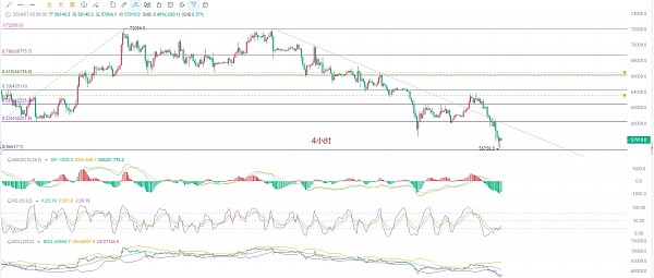 来看今日盘口,截止发稿前零点三十分,比特币现价59800附近,日K线最低56760附近,最高60500附近,下降通道延续,日K线跌破EMA趋势指标支撑点60000关口,别急预计很快就会再次回到六万,短期利空而已,MACD缩量下行,DIF和DEA收缩扳回向下扩散,KDJ跳水,布林带向下开口,K线跌破下轨支撑58250以后回到下轨线盘整,(这一波清算力度没有预想中强,还没有到预期所以别抄底也别朝顶)