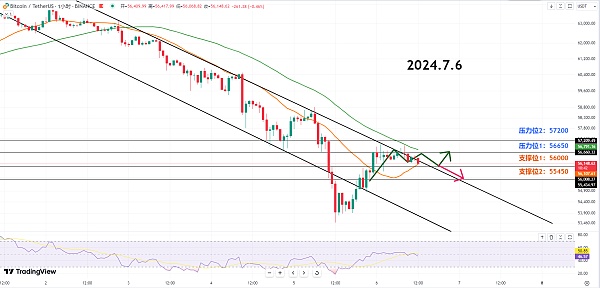 在今天的交易中,尽管币价已经突破了短期下跌通道。但由于缺乏成交量,所以可以在56K至56.6K的箱体内灵活调整仓位。