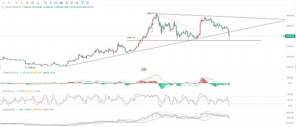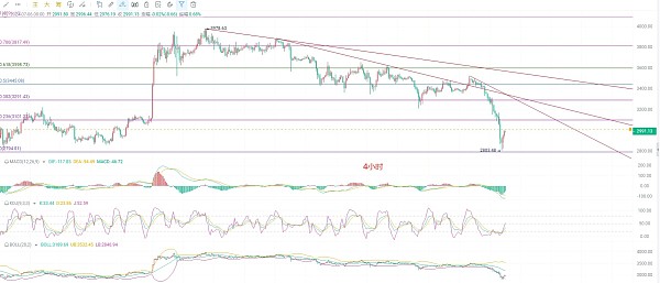 大趋势依旧是空,继续看盘口,四小时K线受阻2800以后反向扳回到了3000关口附近,扳回200点,周末行情大概率又是横盘了,EMA15还在继续向下拉伸,预计会在日内抵达3000关口附近,MACD缩量增筹,DIF和DEA短线收缩,KDJ上行扩散受阻3030,布林带开口向下,布林带中规还在下移,整体趋势依旧是空,思路上高位压力位附近布局空为主,多为辅