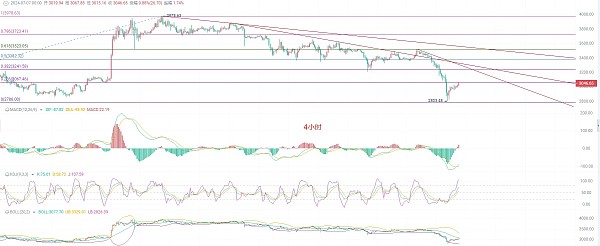 四小时K线已经回到了EMA趋势指标内,短线受阻EMA15压力位3050,上方关注EMA30压力位3140,MACD放量增筹,DIF和DEA低位上行扩散,KDJ向上拉开身位,布林带收缩,K线震荡上行来到了中轨压力位3075,整体趋势上遇到了明显的压力位,可以开始试仓,思路上高位空为主,多为辅