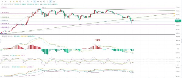 四小时K线连续受阻57000说明这个位置附近有很强的支撑,MACCD放量一直在减少,DIF和DEA底部出现背离上行扩散,KDJ向下,加上布林带收缩,布林带中规压力位来到了58900,底部支撑太高到了55000,表明盘口趋势出现了拐点,多空信号即将明确,思路上在高位布局空的同时一定要带好止损位,防止行情出现突变错过补救的机会,耐得住性子等机会出现