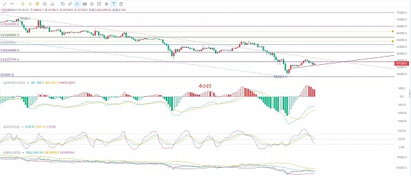 截止发稿前凌晨一点比特币现价57000关口附近,日K线最高58500附近,最低56500附近,下来了2000点,行情不会一走单边,市场需要来回消化,所以别急耐心等回调以后的信号,EMA趋势指标向下交替扩散,EMA15快线已经到了60400附近了,压力位快要跌破6万关口了,MACD缩量向下以后,DIF和DEA收缩失败,KDJ又在和稀泥,收口不收出现了漏斗式口子模棱两可,布林带向下通道延续,日K线回到了下轨支撑点56300之上,周一开盘回不回出现单边?值得思考