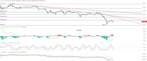 四小时K线原本以为会冲击EMA30压力位3100,没想到受阻EMA15向下继续空,MACD放量下行,DIF和DEA低位扩散受阻,KDJ向下扩散加上布林带向下收缩,趋势出现新的拐点,收缩以后中轨处于3000关口附近的为妙关系,向下就是2890,向上就是3130,思路上可以明确一点,高空为主,低多为辅,日内看回调压力位附近在布局防守