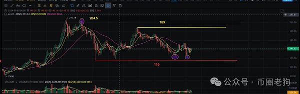 SOL:做为这轮牛市山寨的发动机,SOL目前的表现可圈可点。年内最高价格达到了210美元以上。目前价格在141美元附近。从日线级别来看,之前SOL大跌之时最低价格达到了116美元,之后反弹价格最高达到了189美元价格再次下跌,创出了近期新低121美元。但是从图中可以看出,SOL近期两次向下插针价格都没有跌破120美元,说明日线级别SOL在120美元附近还是有很强的支撑的。