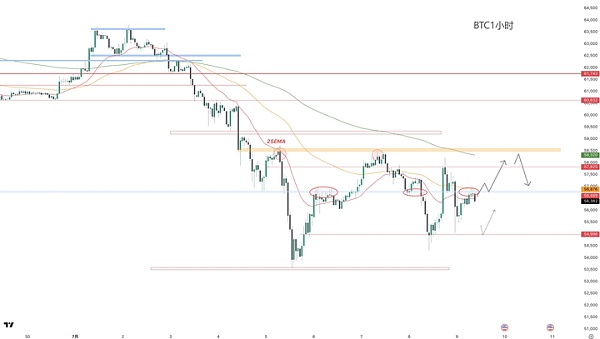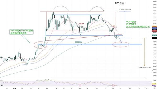 加上当前受到25EMA的阻力,因此空单是必须持有的一个点。 如果做多,那么就需等待颈线位(约58,500美元附近)突破后再顺势入场。