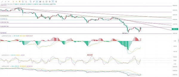 四小时K线已经破了EMA30趋势指标压力位3065,昨日EMA30压力位在3085,压力一直在变,MACD放量上行,DIF和DEA低位扩散上移出现背离,KDJ收缩加上布林带收口多空博弈加剧,四小时快线连续探顶布林带上轨3080以后又探底下轨2900支撑,连续试探,我们要做的就是空仓等机会,急涨急跌的行情别追,很容易被收割
