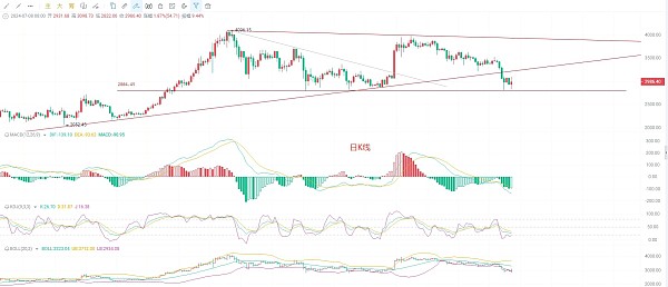 来看盘口,目前日K线出现比较长的上下两根线,说明多空博弈比较激烈,EMA趋势指标向下继续网状扩散,EMA15快线指标已经到了3215,很快就会跌破3200压力点,MACD缩量增筹出现,DIF和DEA背离向下扩散,KDJ收缩上行,布林带向下开口,各大指标都出现了背离,日K线跌破了布林带下轨2930以后回到布林带通道内部,和昨日说的差不多日K线围绕下轨盘整,继续盘整没错,大趋势依旧是空,行情依旧没有扳回