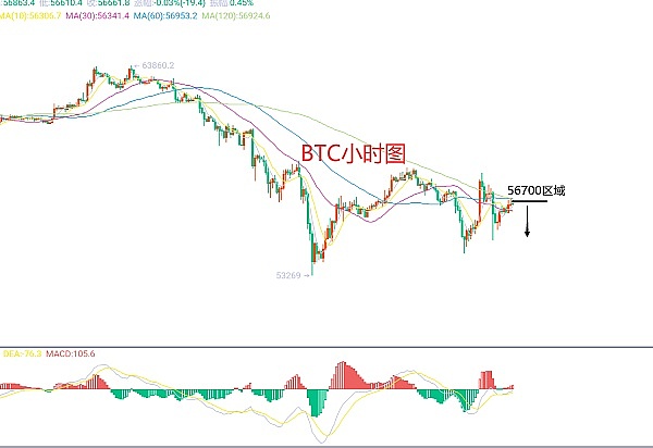 7月9日比特币(BTC)合约技术面分析:今日方面,大周期日线级别昨日报收小阴线,K线形态连阴单阳,价格在均线下方,附图指标死叉运行,在大趋势上下跌还是非常明显的,而我们需要关注的就是价格的下跌力度和延续性,另外注意防范反抽的风险和消息面带来的刺激价格波动;短周期小时图昨日美盘下的探底未果后凌晨持续震荡,今日早间反抽修正,当前K线形态连阳,附图指标金叉,但看不到力度和延续,破高的概率不大,那么日内还是要承压回撤的,因此今日BTC短线合约交易策略:现价56700区域直接空,止损57050区域,目标看56000-55800区域;