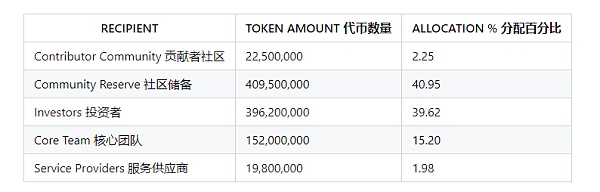 在代币分配方面,社区贡献者2.25%,社区储备40.95%,投资者39.62%,核心团队15.2%,服务供应商为1.98%。
