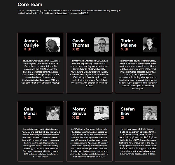 TEN 是个R3“黑帮”创办的项目。R3 是由全球 42 家最大银行组成的联盟,致力于探索基于区块链的 RWA 代币化和 CBDC,R3的投资者包括英特尔、淡马锡、瑞穗、汇丰银行等全球知名机构,R3创建的Corda平台已成为全球知名金融机构使用的DLT平台,发布Corda后R3也被认为大有替代Ripple的可能性。2024年3月15日,TEN 宣布完成一轮 900 万美元的融资,本轮融资由R3领投,Republic Crypto、KuCoin Labs、Big Brain Capital、DWF Labs 和 Magnus Capital 等行业知名机构参投。