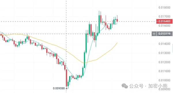 这个币羡羡在星期一的时候就说过,他不跟跌,后期会有很强的爆发,可继续持有,在前几天强势发力后这两天一直站稳在00155上方,这是强势的表现,暗示将继续冲。