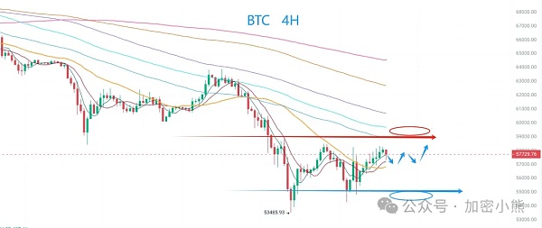 BTC日线的震荡结构来到了中段,后半段的震荡范围只能说会更小。走横盘路线的话这个上下轨在56930~58891。日线振幅仅仅1%的情况下没有多大的操作空间,就耐心等待离开震荡段的反向操作机会!