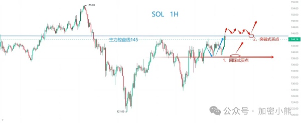 SOL本次的反弹在主力控盘线145二次受阻,145~148是当下面临着的一个压制区间,如果价格能够突破,且在145上方横盘8~10小时左右,可以当作机会去看待,要注意的是一定要满足时间要求,否则有假突破的可能性。如果回调,就是短线抢反弹的机会,点位参考138.2~140。