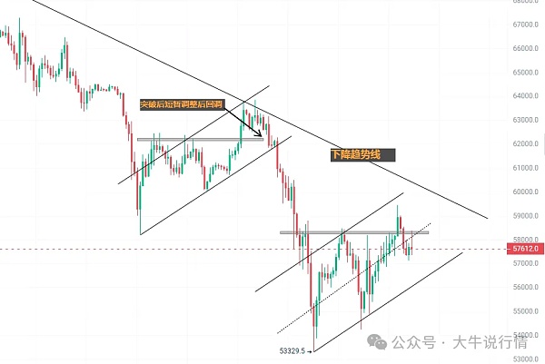 很多人会考虑这个位置构成了右侧底部抬高的双底,然后前方的高点颈线已经破位,直接去进行多头的追入。但其实我们在过去一段时间反复的跟大家强调近期如果看反转,最为值得参考的是图中这条下降趋势线。如果这一线不被突破的话,行情就还是在通道之内做调整,如果这一线形成突破那我们将会看反转,所以目前还没有构成我们看反转的条件。相较于不停的在摸底,左侧去预测反转的这一类交易者的话,我们一直是要等待的是确定信号的发生,而不是说初步信号的形成。