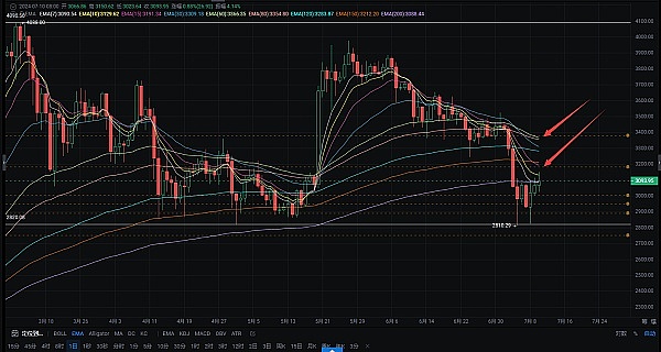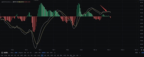 也正是4小时图中K线在反弹至EMA60上方后并未和大饼一样到达EMA80位置,看来以太并没有前一段时间的光辉时刻了,按道理他的反弹力度更为强势一点才对,但是反弹承压下行幅度也不是大,当前币价下方存在EMA30与EMA15交叉重合小支撑,但是问题也不是很大,如果在此位置反弹的话那么就完美给到建仓或者补仓机会,再看大饼这个交叉重合支撑已经破位了,日内也可以重点关注一下此位置;