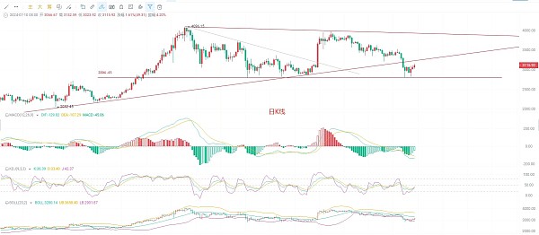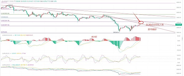 截止发稿前凌晨一点,以太坊现价3120,日K线最高3150附近,最低3023,自从四号跌破上升三角以后日K线总算出现扳回趋势,回踩上升三角压力位的苗头出现了,虽然压力位在3230附近,也不影响我们在3130提前布局,毕竟大趋势依旧是空还没有扳回,EMA趋势指标依旧是向下扩散结算,MACD连续三天增筹缩量上行,DIF和DEA收缩,KDJ上行金叉成型,但是布林带还在向下开口,中轨压力位3280,下轨支撑却在2900附近,短线拉伸不破趋势关键压力位,那么依旧是空