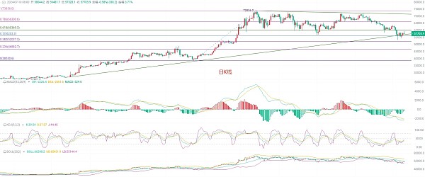 来看今日盘口,截止发稿前比特币现价57700附近,日K线最高59500,EMA15趋势快线压力位已经跌破了59500,没错空单已经上车目前持有中,EMA趋势指标整体依旧是网状向下交替扩散的大空势头不变,继续持有,MACD缩量增筹K线背离,DIF和DEA低位收缩,KDJ上行扩散受阻,布林带向下通道延续,日K线冲击布林带中规60300失败回落,下方支撑点关注55150