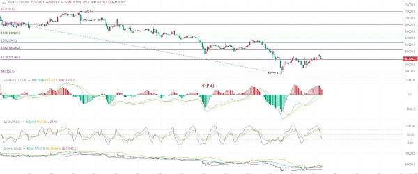 四小时K线冲击EMA90压力位59500失败以后回落到了EMA15和30的交叉点57600附近盘整,这个位置毕竟是趋势线交叉点盘整时间渐渐久一点能理解,MACD放量下行,DIF和DEA还没有就结束上行两极分化就开始在0轴线收口,KDJ向下扩散,布林带上轨虚破以后回弹向下站立在布林带中规先57200附近,趋势未变高位空单布局继续持有,继续下看