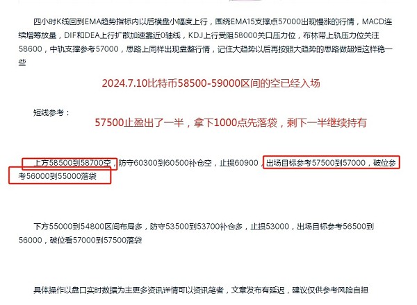 等了很多天的入场点58500,一直到10号中午十二点过七分才开始入场,防守点虽然没有进去,但是目前在57500止盈出了一半,剩下继续持有中,吹牛的话就不说了,拿下1000点没有什么值得骄傲的,只要记住一点你要上的车再没有来之前在车站等着就行了,希望你能听懂,