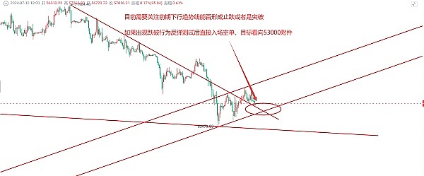 昨日晚间,CPI信息小利好行情出现反弹向上触及上方前期高点,形成双重顶部过后行情再次继续走跌。目前行情触及下方前期下行通道支撑。能否形成止跌,在目前德国,美国以及门头沟在持续出现货的一个情况下。行情具备反转的可能性会很低。但是市场现在处于一个很低的点位,下方存在较大的买盘。目前整体行情可能还是会去看看一个偏震荡下行的趋势。在下方底部形成反弹过后,形成了新的上行通道。在下行曲线跟上行通道的交界点存在的低点。参考点位可能就是在56000附近。如果下行趋势线以及上行通道交界点没有能够形成有效止跌,那么下方我们需要去关注的地点可能会是在53000附近。目前整体行情还需等待行情出现企稳信号或者跌破信号。再去选择多头或者空头。