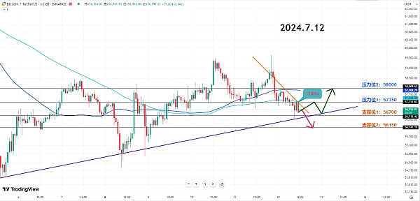 若突破第一阻力位那么币价就将会上涨到120MA均线的上方,可延续短期上涨,但需关注58000的心理阻力位。