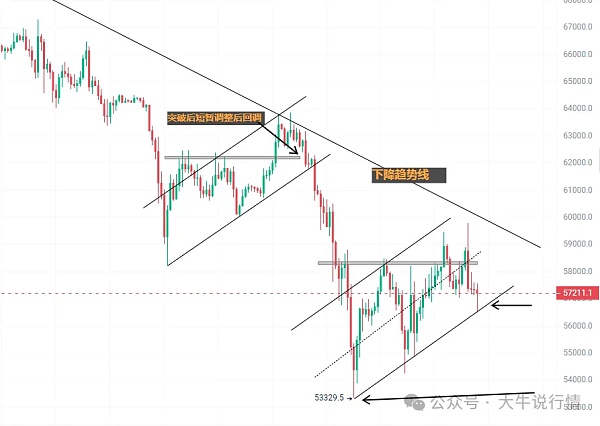 所以我们维持原有的观点不变,图中的下跌趋势线不破位,那么反弹上去就是给到我们高空的机会,尽管通道中的波段高点有在提高,但是每一次都是突破失败后大幅回落。具体跌倒哪里,首先就是通道中的下边界处,其次则是前方的低点。