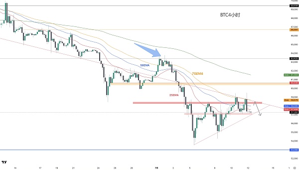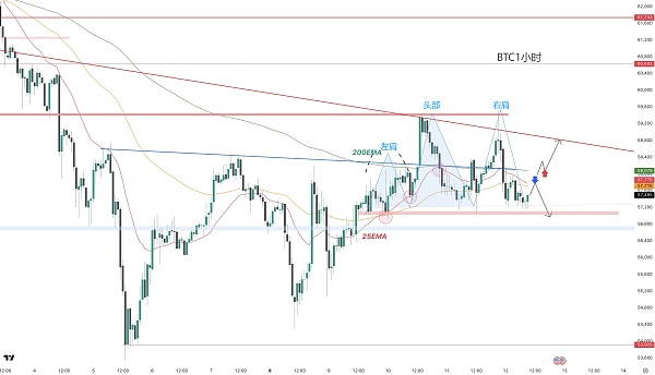 ①以1小时图25EMA为短期压力做空,做空价:57,600美元。