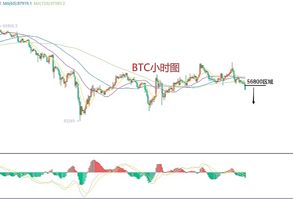 7月12日比特币(BTC)合约技术面分析:今日方面,大周期日线级别昨日报收小阴线,K线形态连阴下跌,虽说力度不大,但附图指标死叉向下,整体走势还是明显的下跌优势且大家可以看到走势方面即使价格破高,后市还是会承压快速回撤抹平跌幅,这就说明反抽是没有力度的;短周期小时图昨日美盘价格承压回撤今日早间延续,当前K线形态连阴下跌,附图指标死叉运行,价格在均线下方,那么日内大概率还是要延续的,关注其力度和能否破位即可,因此今日BTC短线合约交易策略:反抽56800区域空,止损57150区域,目标看56200-56000区域;