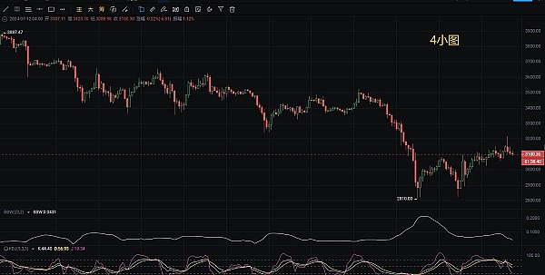 昨日以太延续震荡上行走势晚间CPI数据公布以太突破短期压制3150后迅速反弹至3216后收了一根长上影线开始承压回落,目前价格在3100附近运行,小时线来看当前MA5 10日均线小幅粘合共振上行,指标上看MA30日均线和BOLL带整体轨道当前依然偏向弱势,目前在震荡区间盘整,整体思路波段反弹空为主,