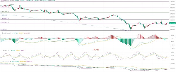 连续三天高位布局空单,来回连续吃大部分人拿下了3000点以上的空间,思路没有变,虽然目前盘口进入盘整周期,但是大趋势依旧是空,顶底压力位没有破之前依旧可以高位布局空,来看盘口截止发稿前凌晨一点,比特币最高58500下方,最低56500之上,短线趋势盘整周期也就在这区间了,EMA趋势向下扩散还没有结束只是进行了一半的周期,EMA15快线指标已经跌破了59000,行情出现背离,MACD缩量结束开始放量上行,DIF和DEA低位收缩成型,日K线反而受阻58000,KDJ上行扩散快布林带向下通道依旧没变,短线周期扳回,但是没有必要追多