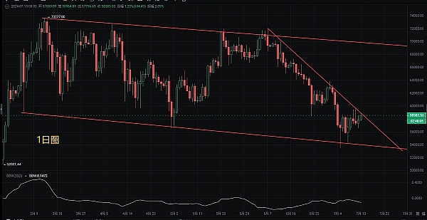 日线级别来看,价格仍处于日线EMA15均线压制下,日内震荡上行并未突破此压制区域,虚探之后再回调,EMA15均线和中轴保持平行向下。此区间后市如未有效突破站稳,那么大趋势依然未变,后市大概率会继续维持震荡盘整理,后续关注上方59600压制位置,预计价格还有下探的风险,所以日内思路维持反弹空为主。当前走势上看区间关注57500-58900区域即可。