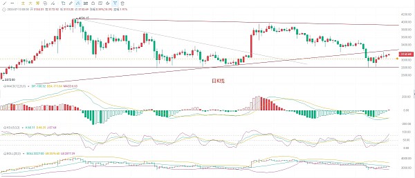 以太坊又一次进入了空单的建仓范围内,前面文章说了顶底压力位在3230到3250区间,我们一般都是在压力位之前开始试仓也就是3165附近试仓,可以看到日K线最高3175以下,最低3110以上,截止发稿前凌晨一点,日K线处于EMA趋势压力位3175附近,EMA15快线已经跌到了3170还在进一步下探,但是快线出现慢涨,MACD缩量增筹结束开始放量上行,盘口的动能一直在增强,KDJ上行扩散,日K线也来到了布林带中规3225下方,